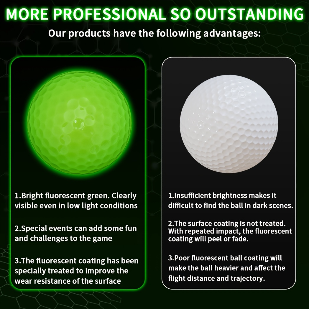 High Visibility Fluorescent Colors:Bright fluorescent hues ensure your golf balls are easily seen during night play, reducing the chance of losing track.