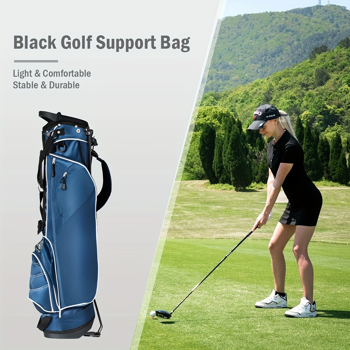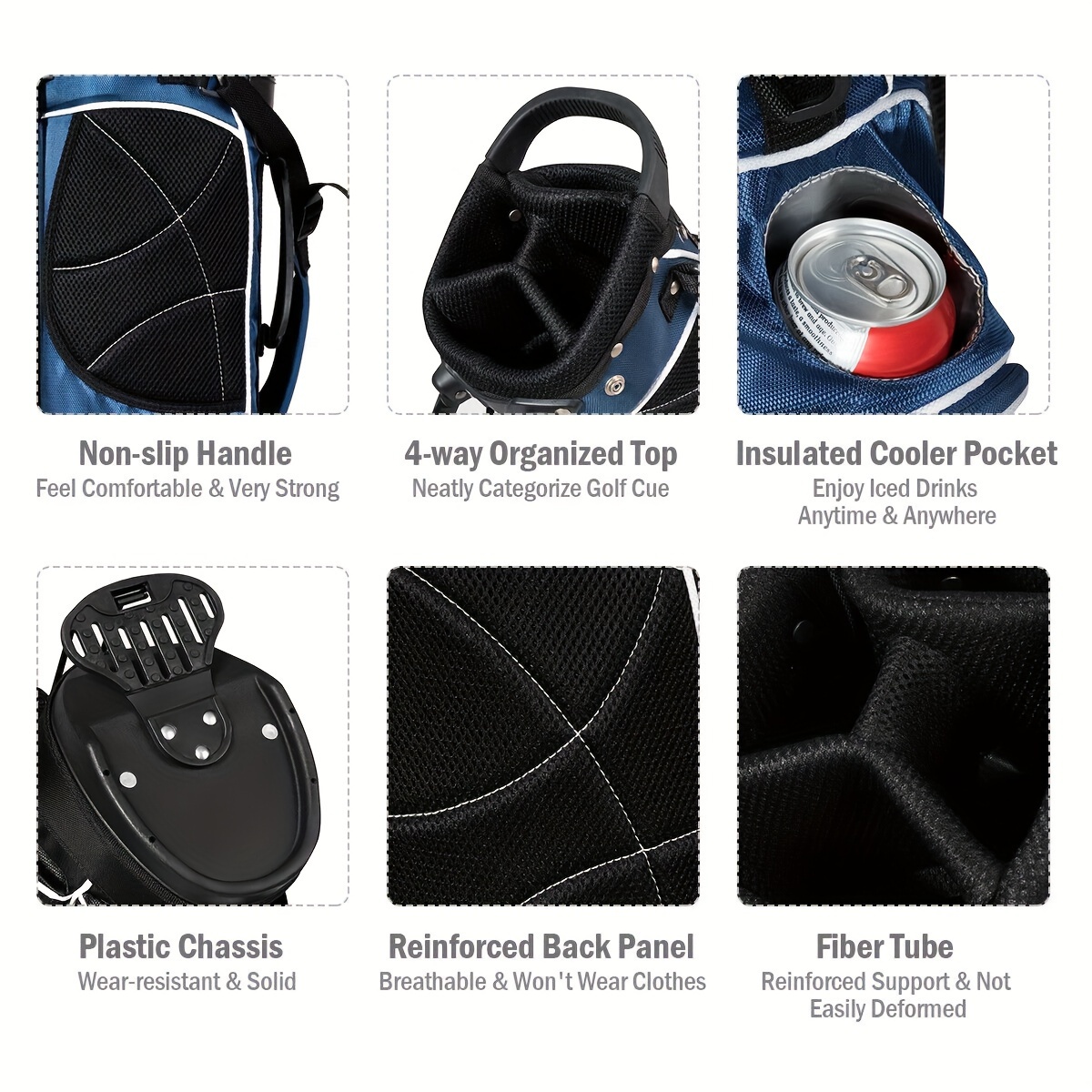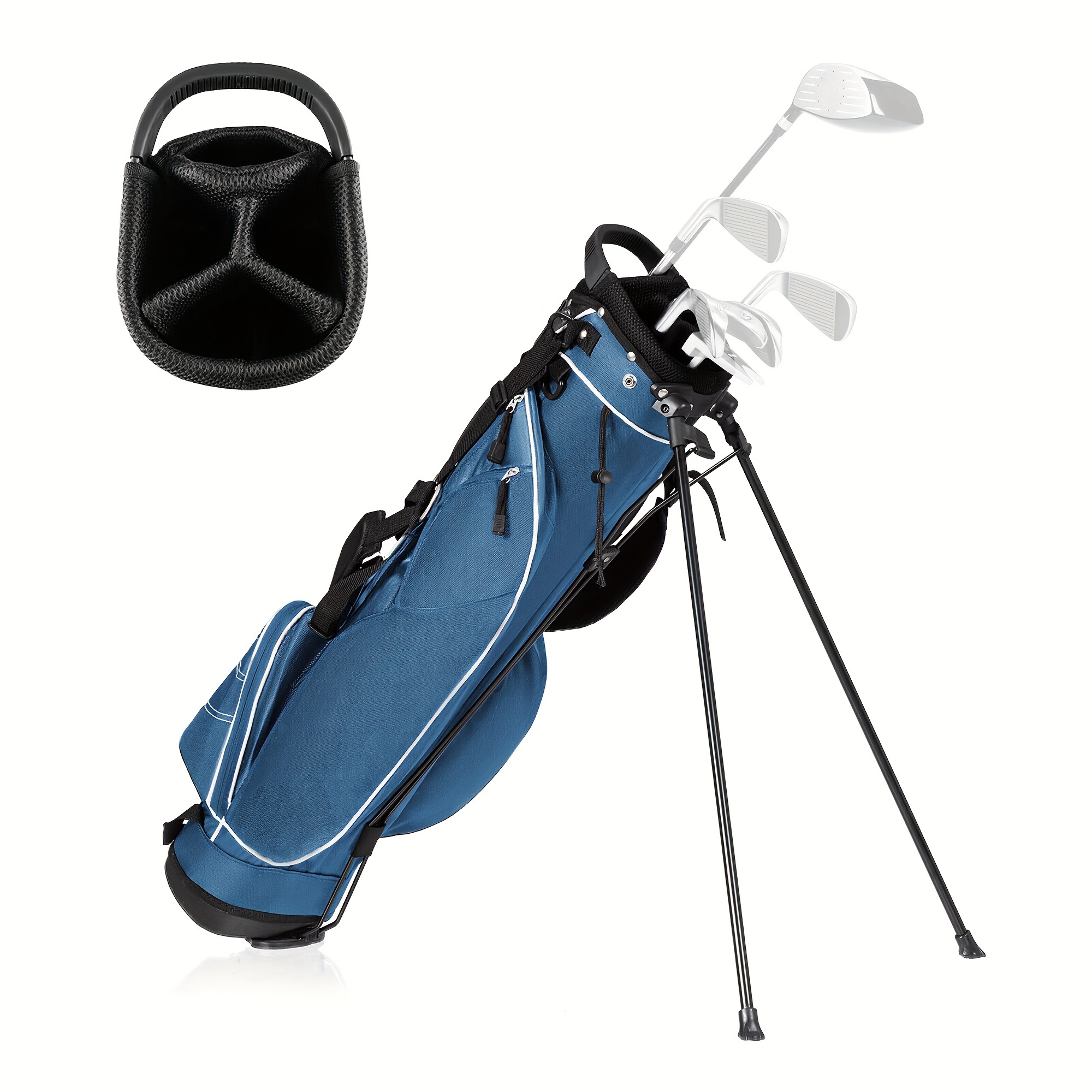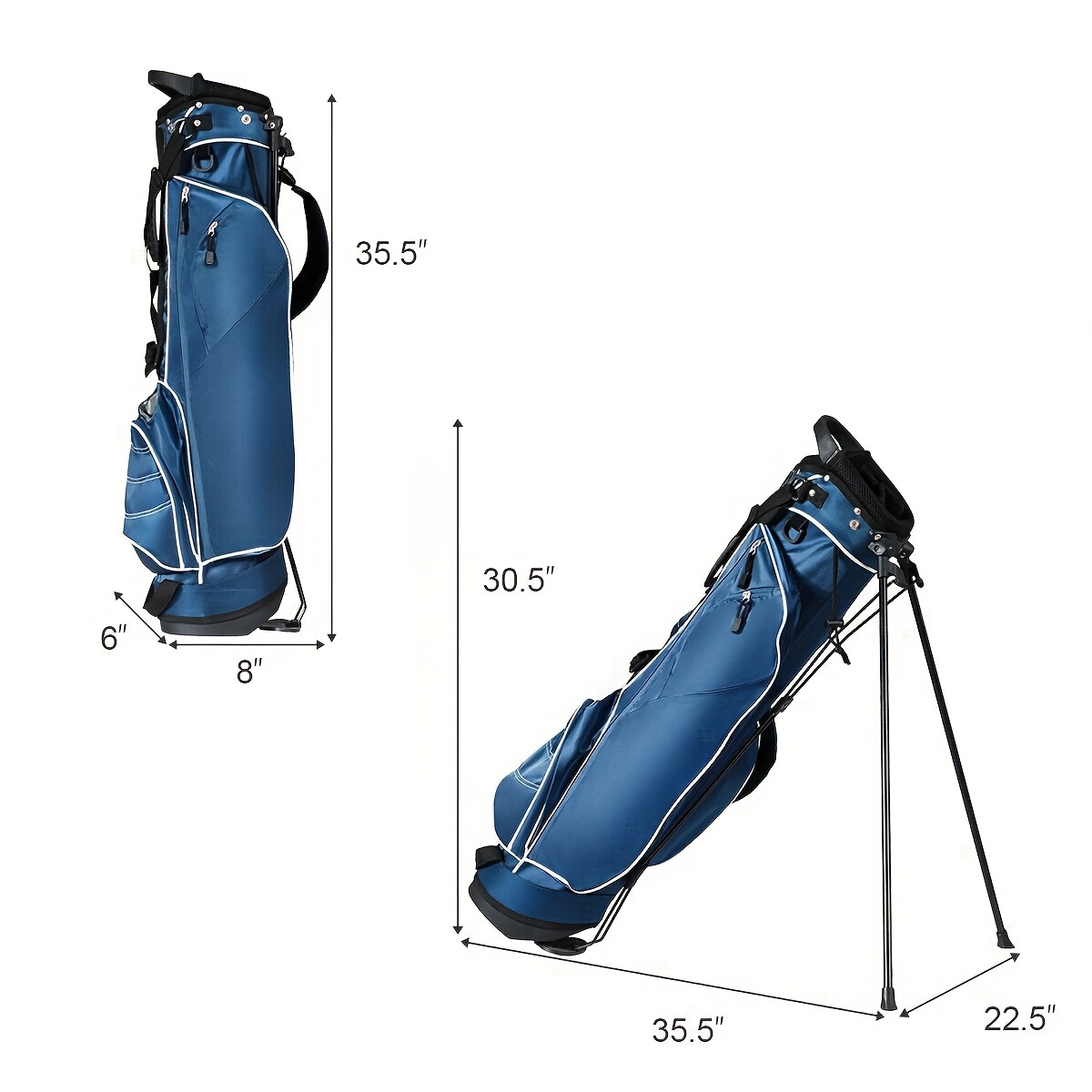 Specifications:Color: BlueMaterial: Polyester Fabric, Within The Three Fiber Supporting Tube, Iron Foot Pipe Support, A Rubber Foot Pipe Bracket, PP PlasticParts, Plastic ChassisSize Of Head Frame: 6”x 8”Bag Length: 35”Unit Weight: 3.5lbsPackage Includes: 1 X Golf Stand Bag