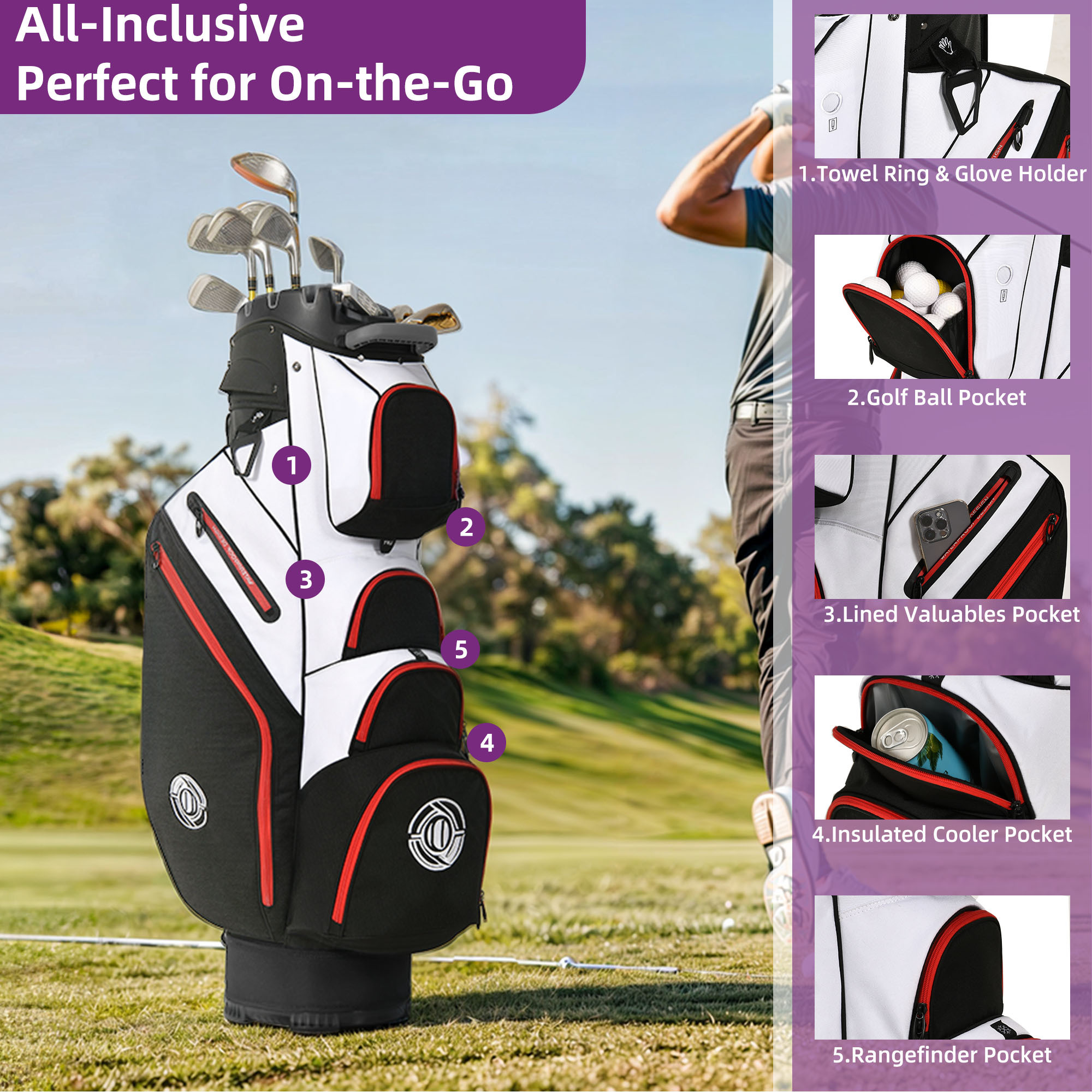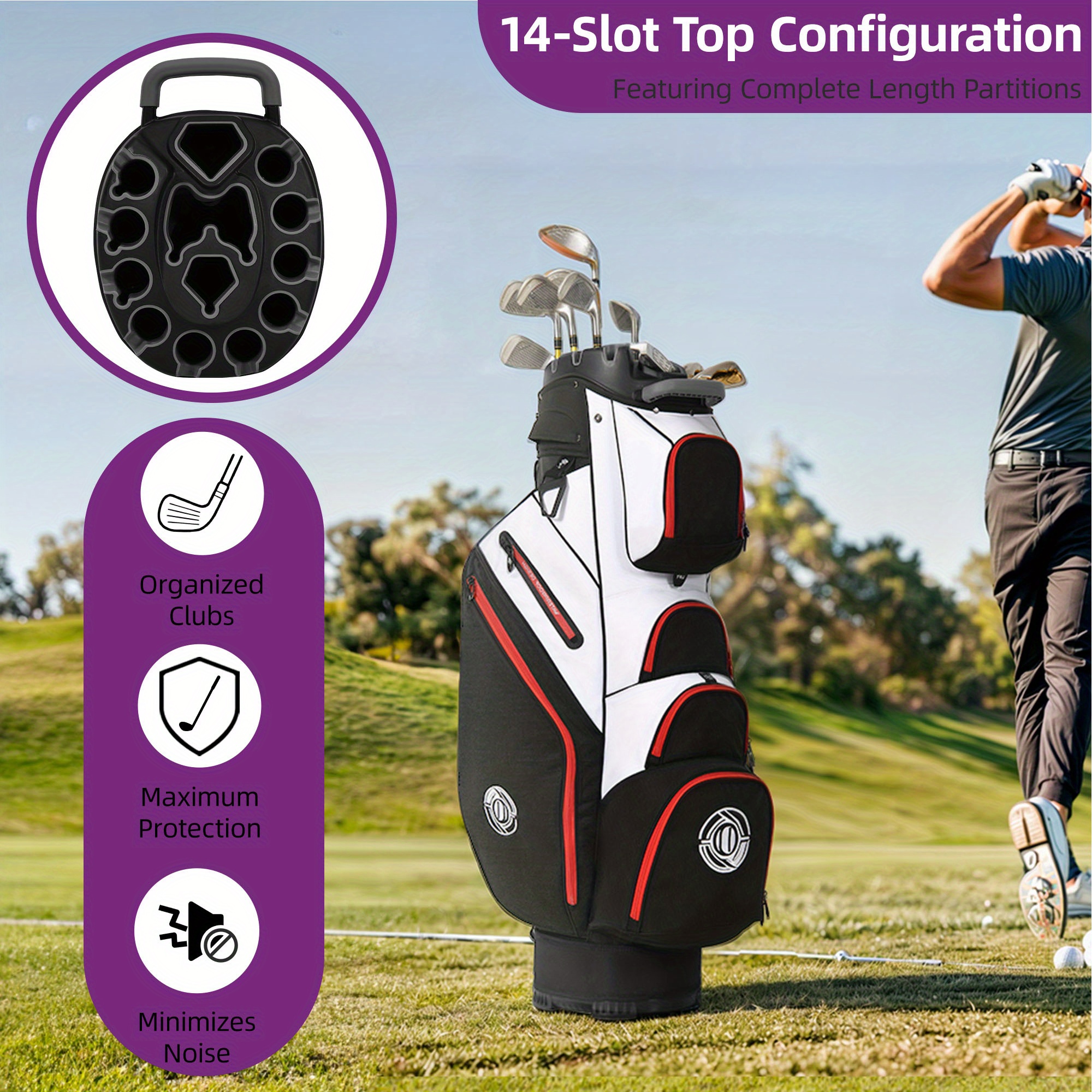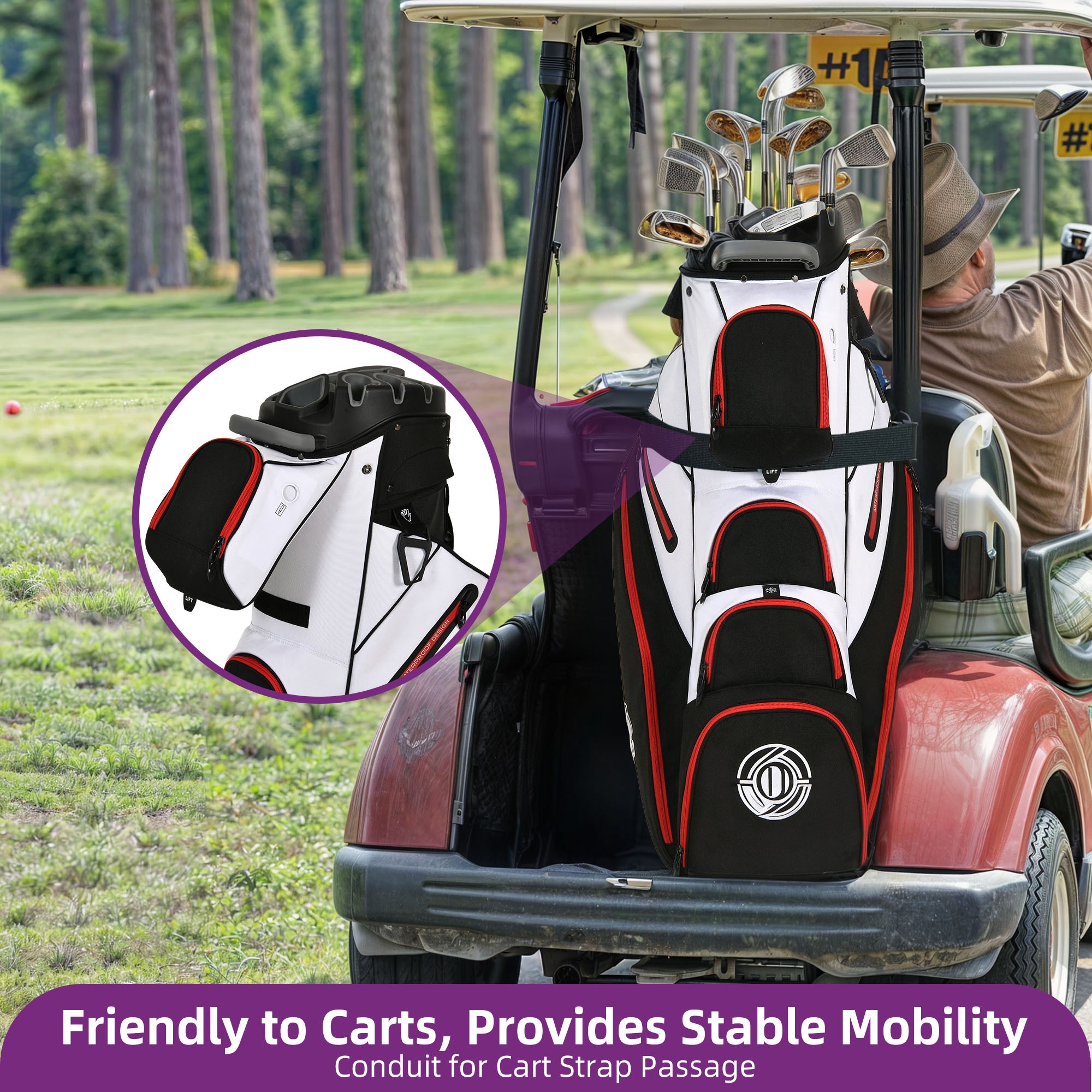 Enhance your golfing experience with the Golf Cart Bag. Keep your clubs organized with 14-way protection and full-length dividers to avoid any damage and noise. Experience comfort with cushioned straps and several handles for effortless lifting. Be ready with 8 pockets, featuring a cooler and a pocket for valuables. The cart strap pass-through allows for convenient access to your essentials. Made with water-resistant material and a chic design, make a statement on the course in both practicality and style.
