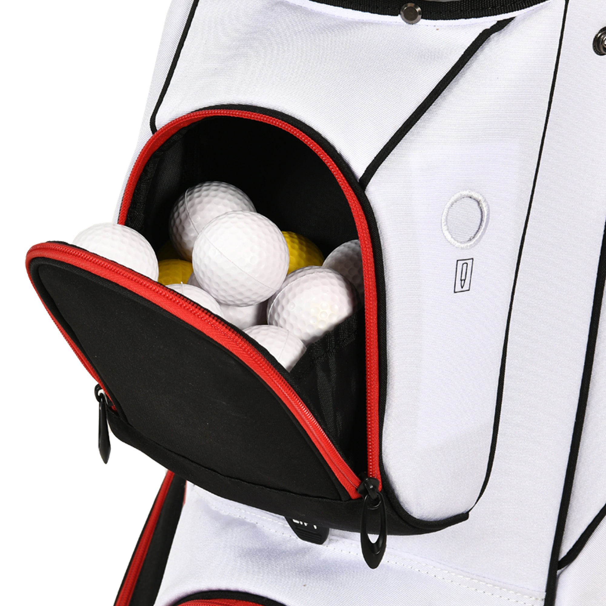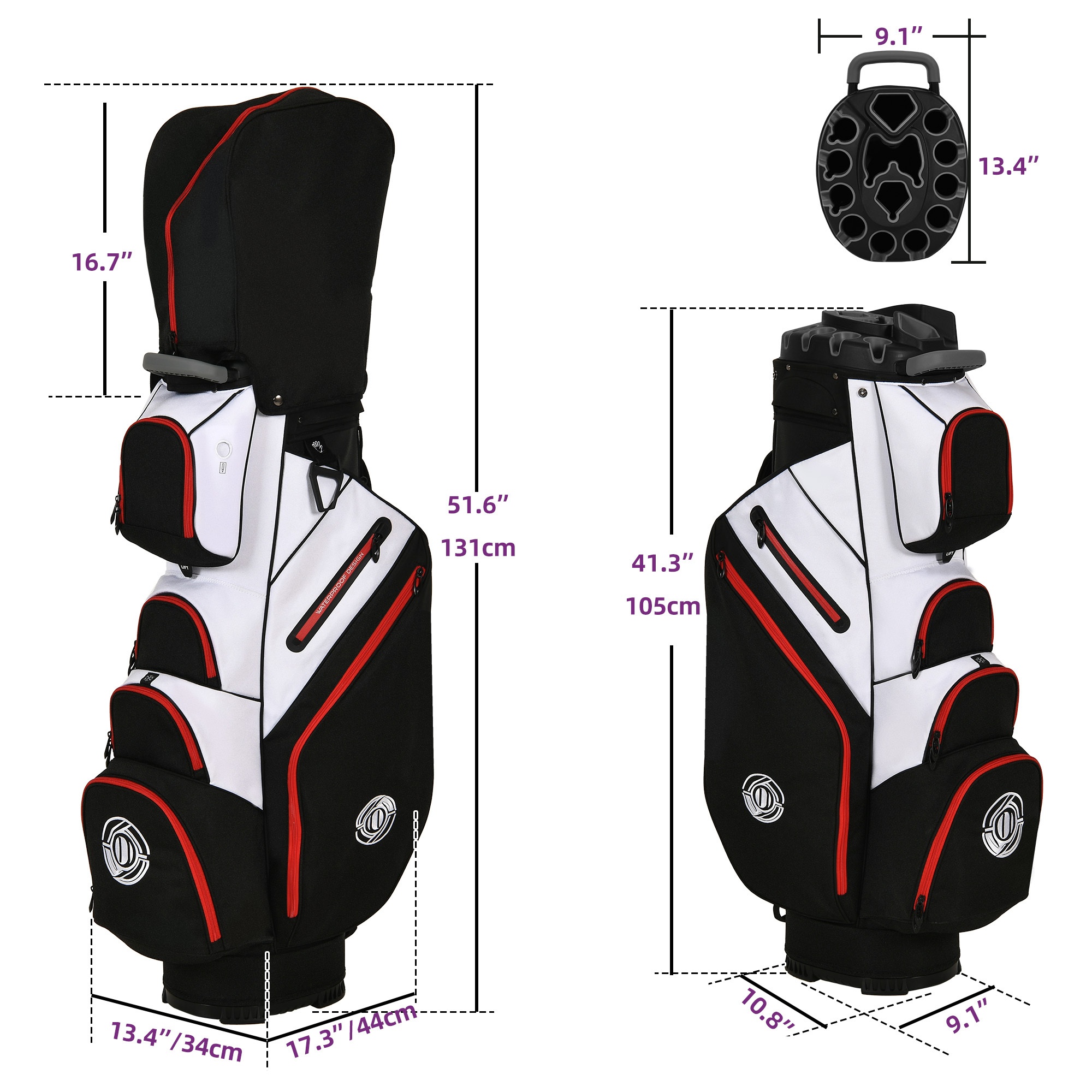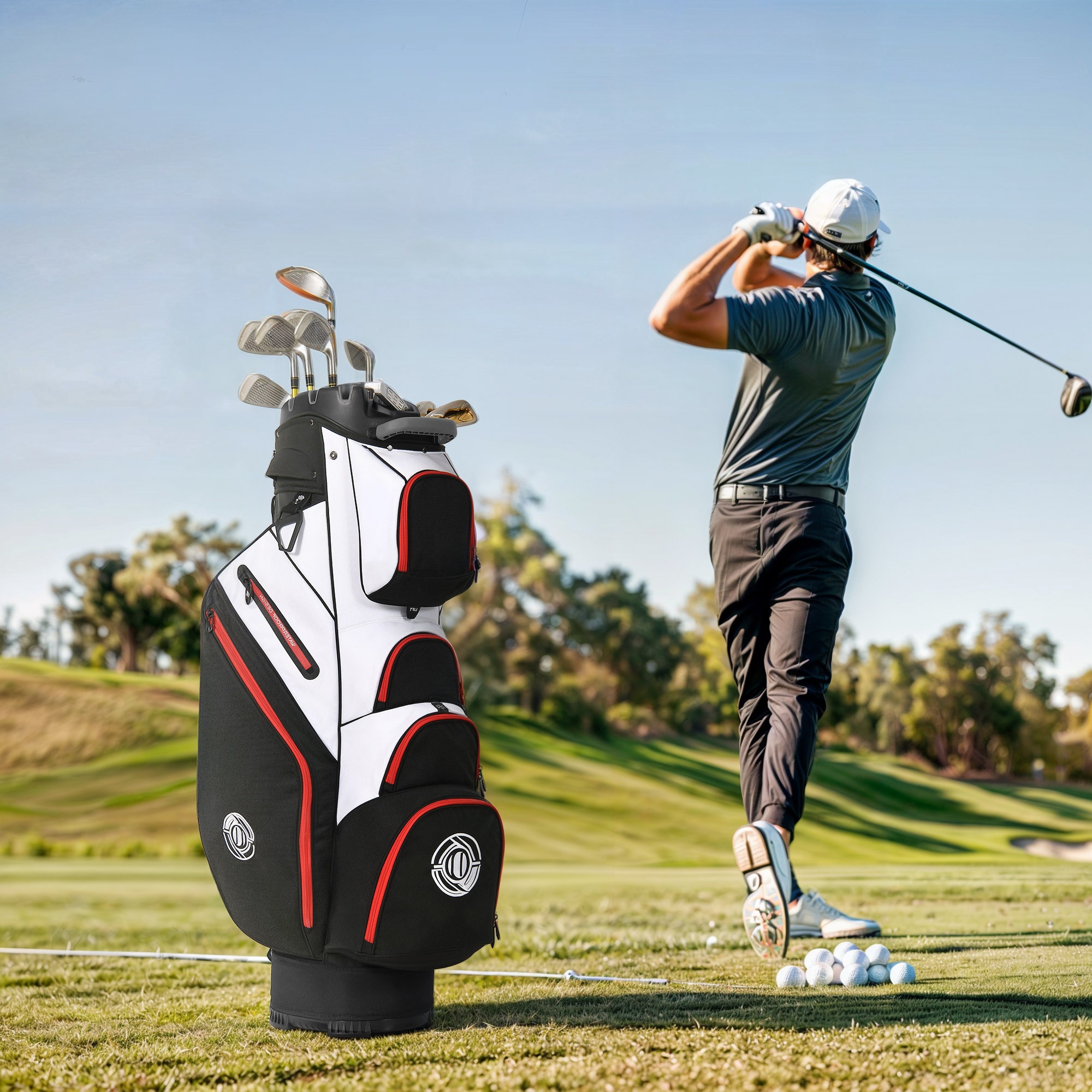 Enhance your golfing experience with the Golf Cart Bag. Keep your clubs organized with 14-way protection and full-length dividers to avoid any damage and noise. Experience comfort with cushioned straps and several handles for effortless lifting. Be ready with 8 pockets, featuring a cooler and a pocket for valuables. The cart strap pass-through allows for convenient access to your essentials. Made with water-resistant material and a chic design, make a statement on the course in both practicality and style.