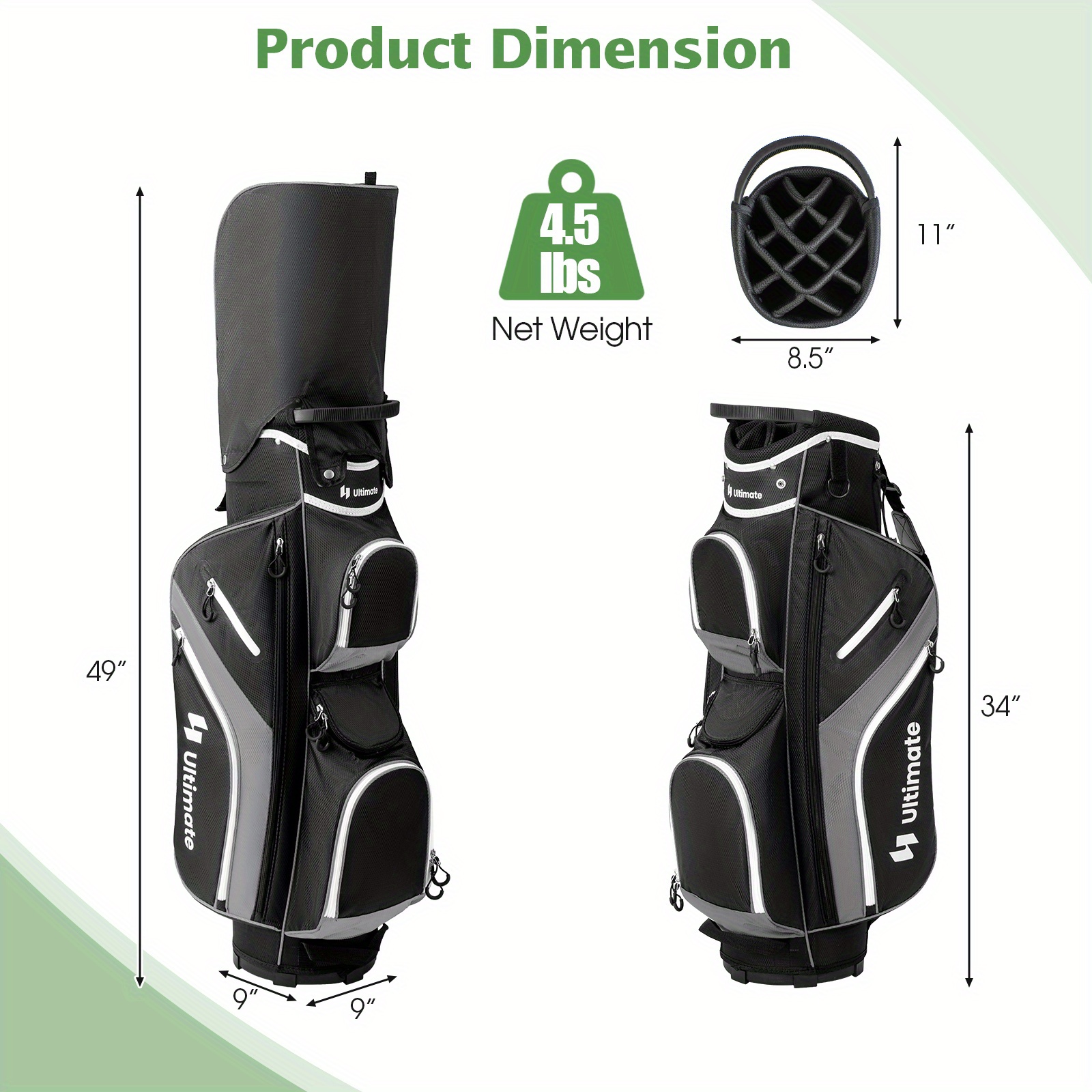 Designed with 9 zippered pockets for various golfing equipment.
