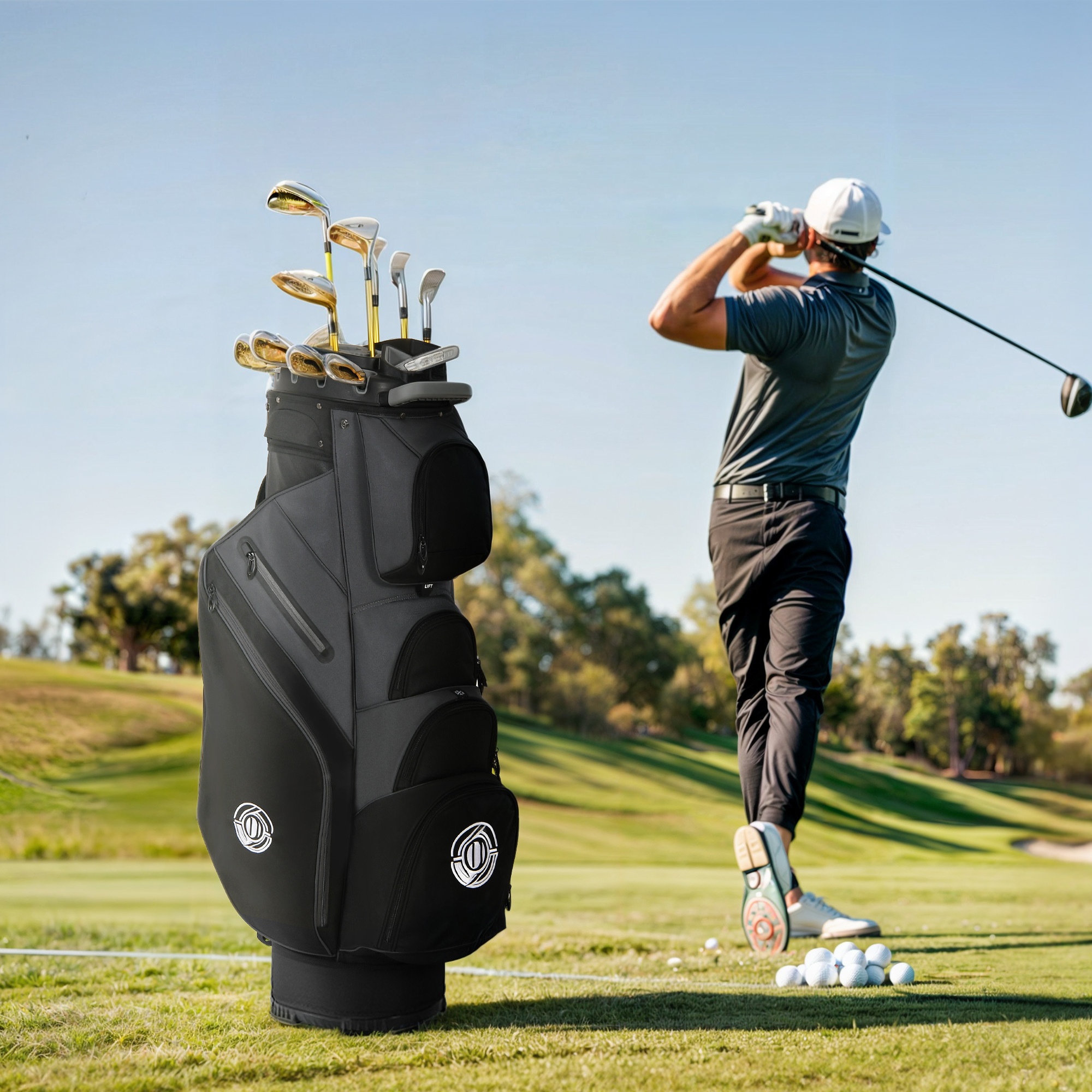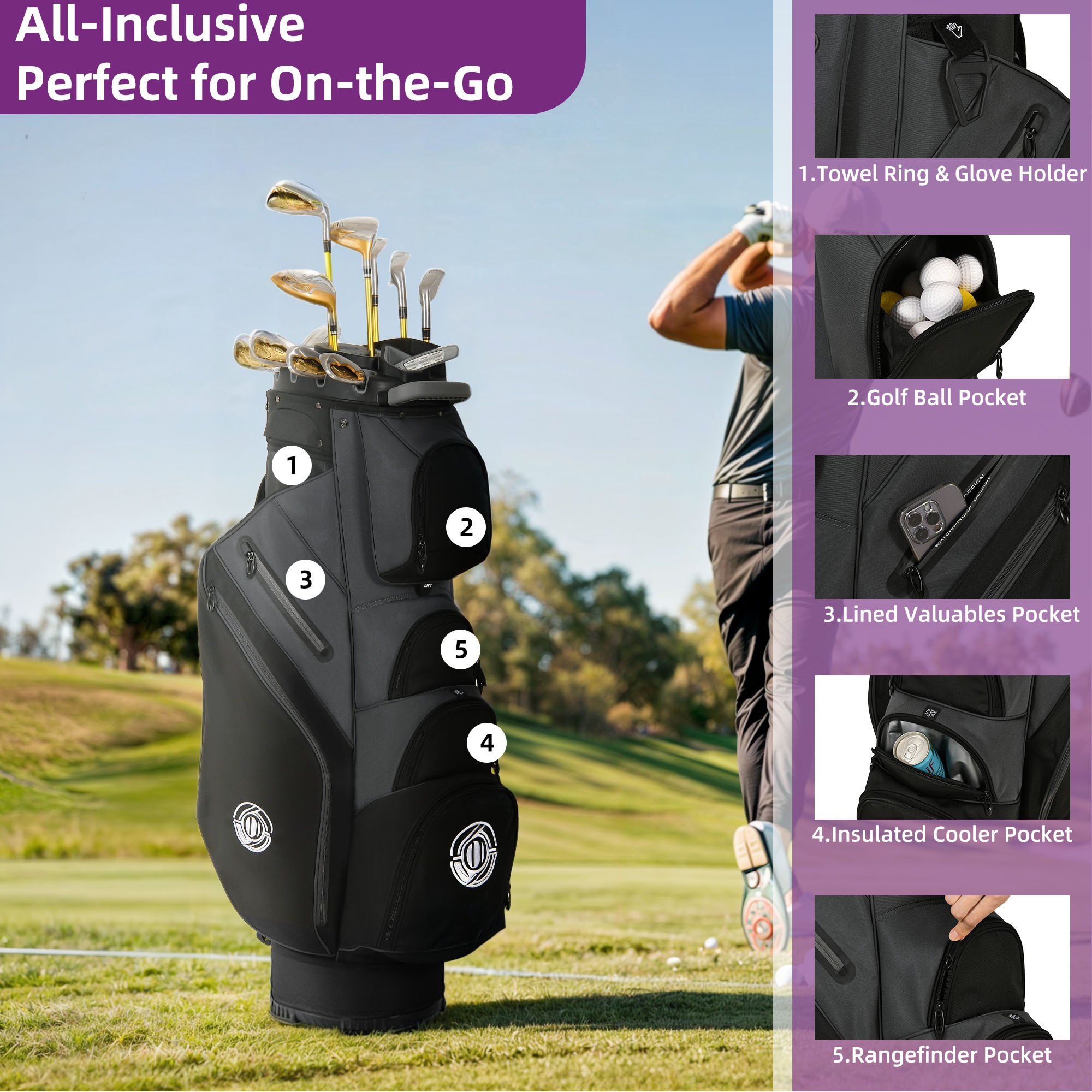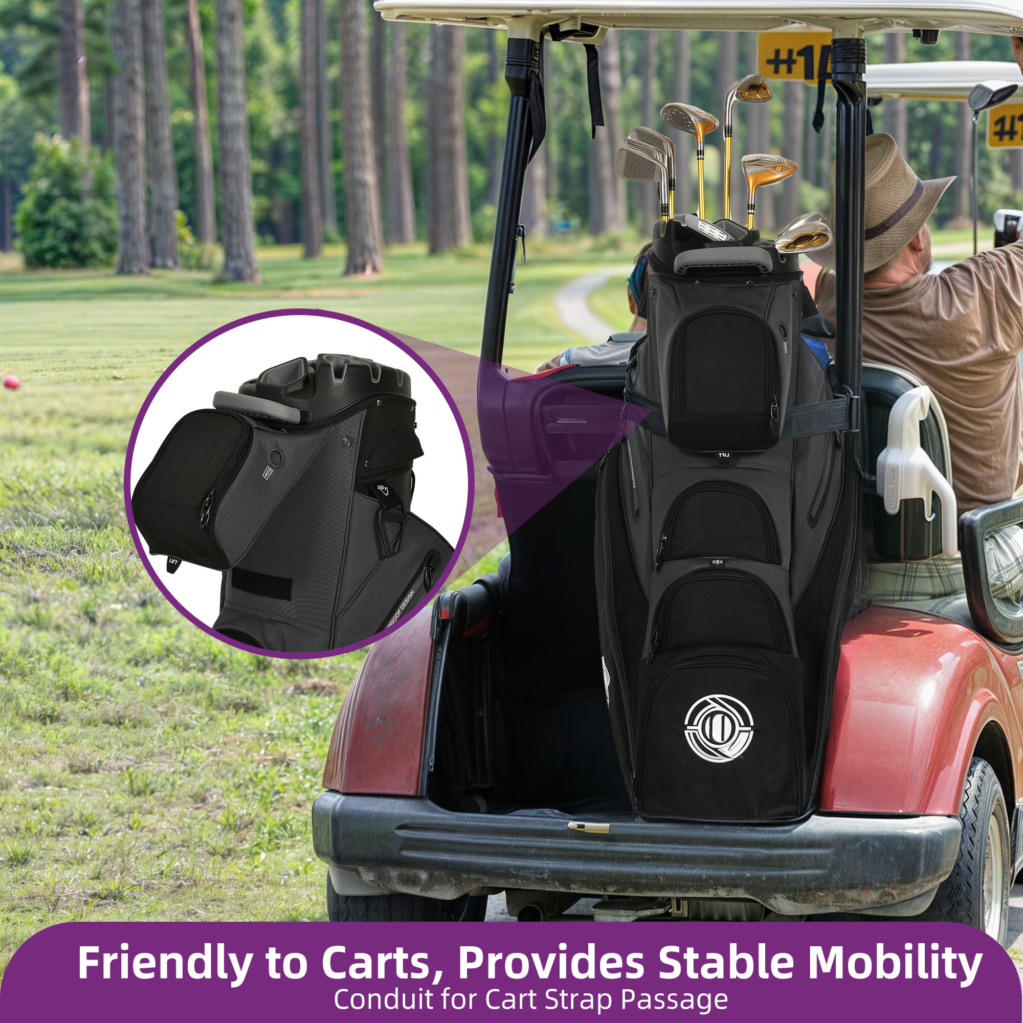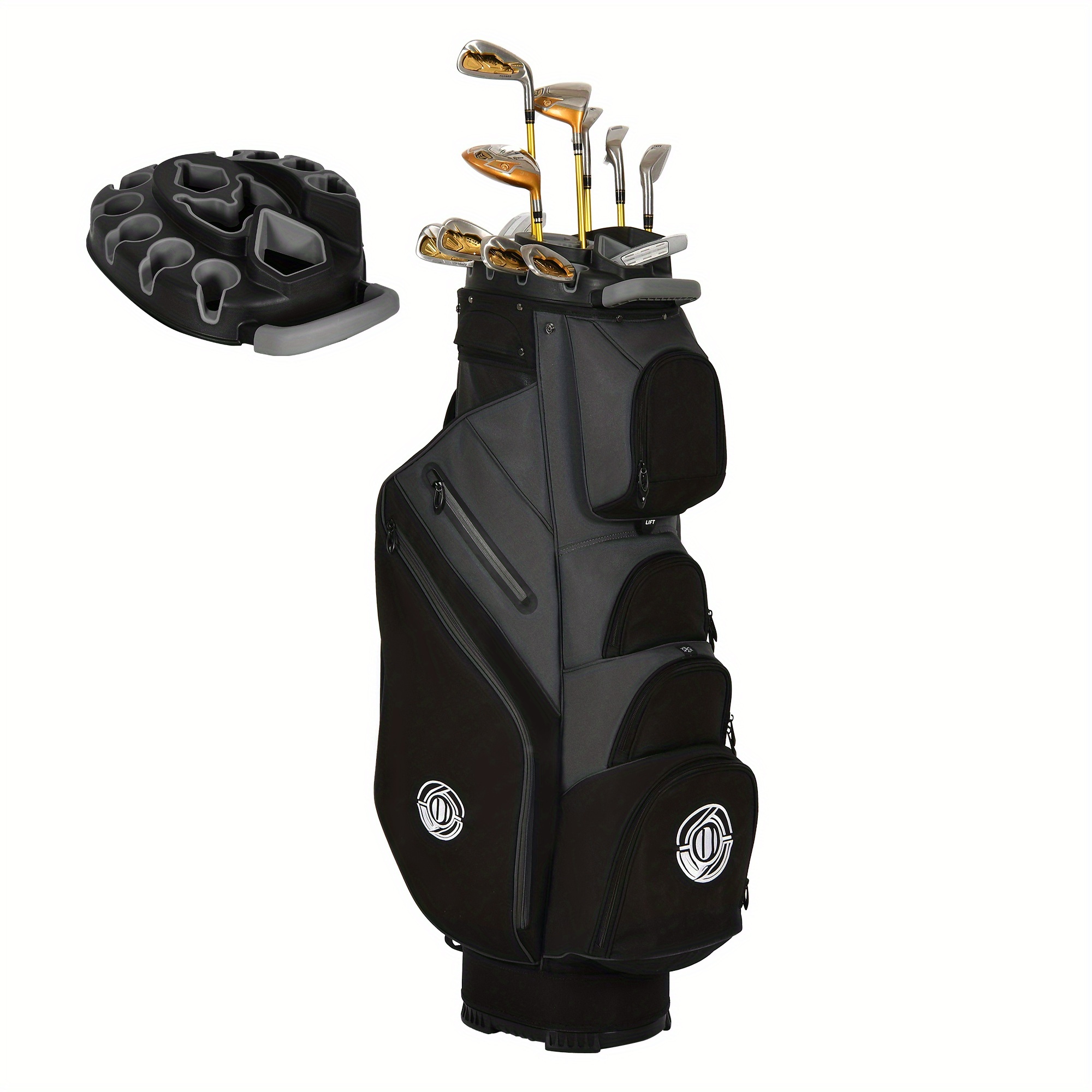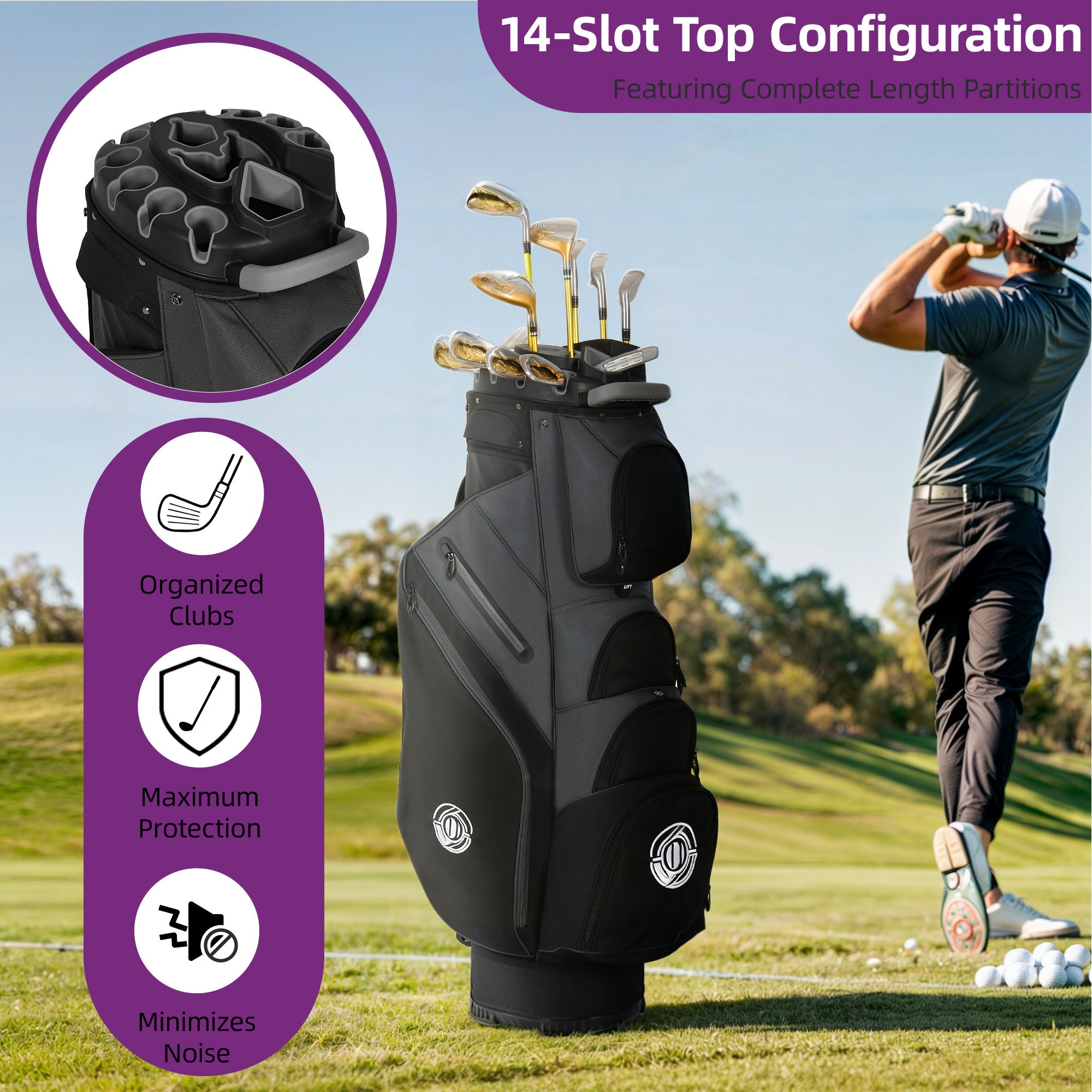 · This cart bag features a 14-way top with full-length dividers to help organize golf clubs during transport.