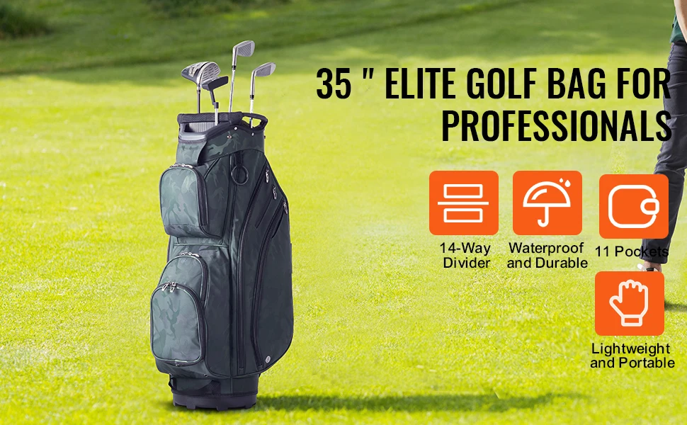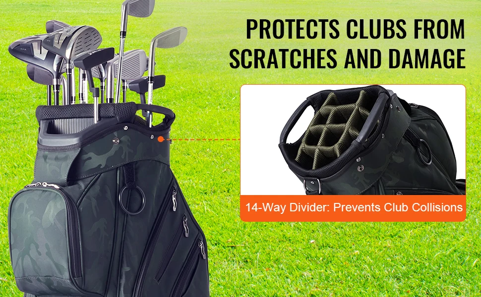 • Our golf bag comes with a 14-way divider system suitable for 35-45'' clubs. The thickened sponge protection keeps the clubs separate, preventing collisions, scratches, and damage.